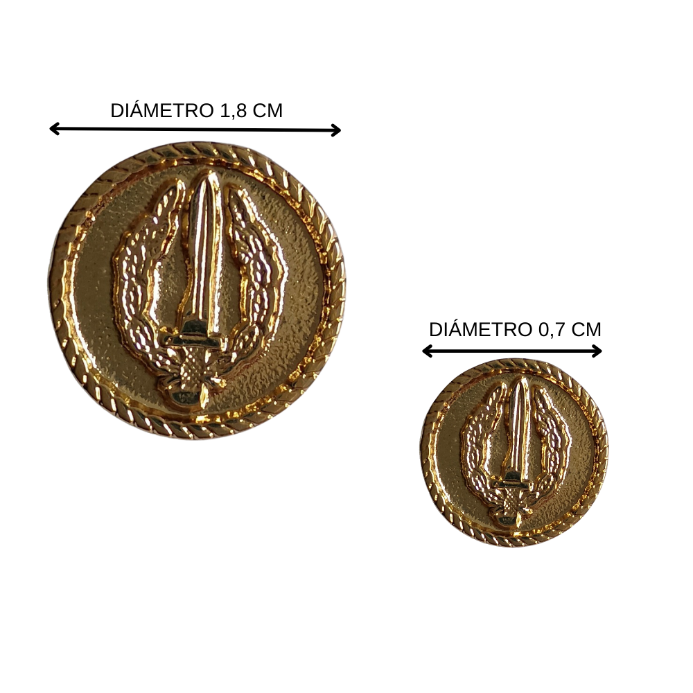 Auténticos botones metálicos dorados utilizados en la chaqueta oficial de la Federación de Veteranos Boinas Verdes. Incorporan el escudo de Operaciones Especiales —roble y machete sobre fondo texturizado. Los botones se venden en pares de 6 (6 de 1.8cm y 6 de 0.70cm)