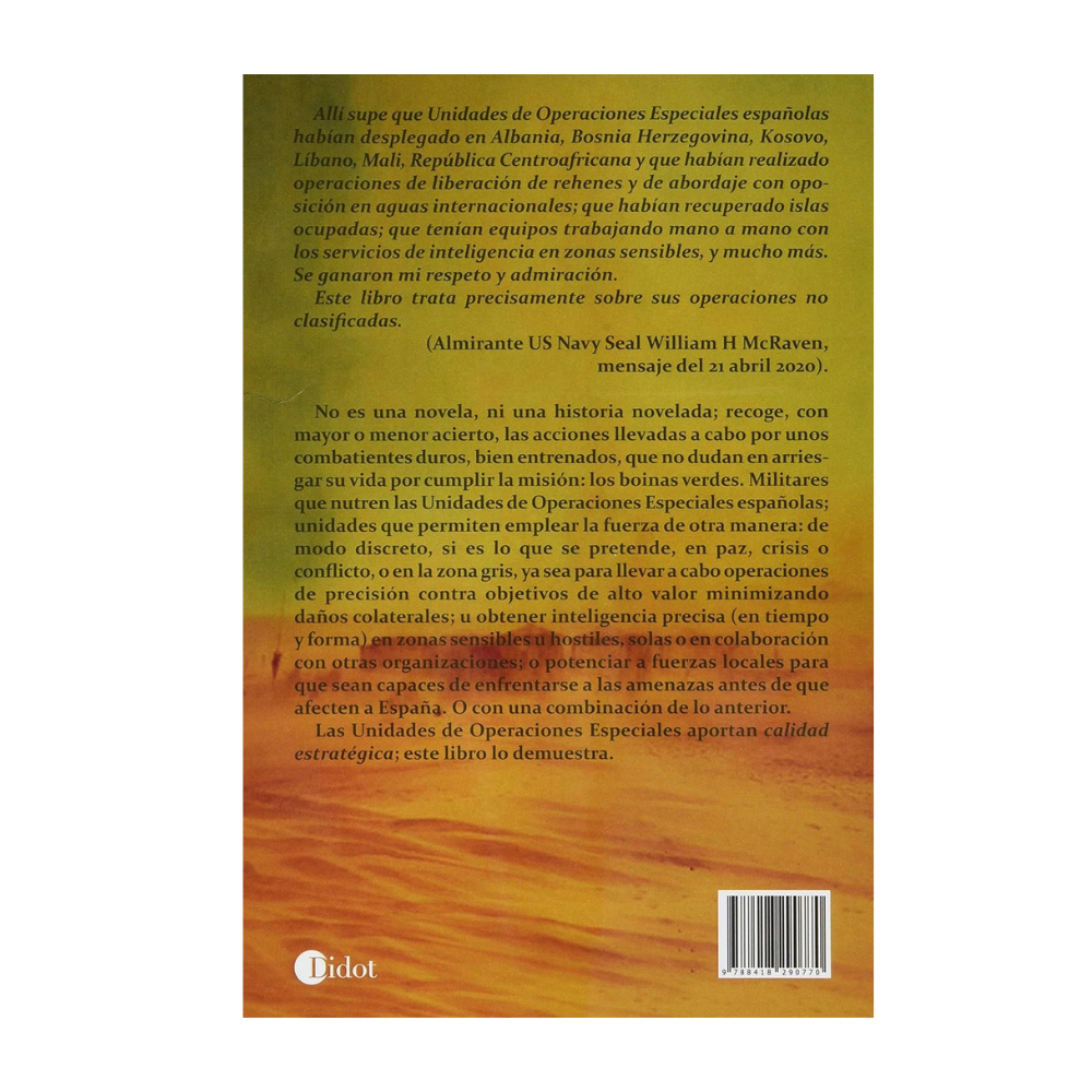 Este libro reúne testimonios y operaciones reales de las Unidades de Operaciones Especiales españolas en escenarios como Kosovo, Líbano, Mali o la República Centroafricana. No es ficción ni una narración novelada: expone con rigor misiones de alto riesgo, acciones de inteligencia en zonas sensibles y operaciones de precisión ejecutadas por boinas verdes altamente entrenados. A través de estas páginas se muestra cómo estas unidades actúan de forma discreta cuando es necesario, colaboran con servicios aliados, apoyan a fuerzas locales y afrontan amenazas que pueden afectar directamente a la seguridad de España. Una obra que evidencia el valor estratégico y la profesionalidad de quienes integran nuestras fuerzas de operaciones especiales.