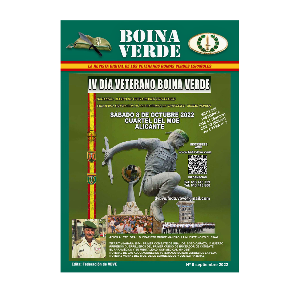 Edición dedicada al IV Día del Veterano Boina Verde, celebrado en el Cuartel del MOE en Alicante. Incluye homenaje al Cte. Gral. Evaristo Muñoz Manrique y detalles del evento organizado por el Mando de Operaciones Especiales y la Federación de VBVE. Una publicación cargada de emoción, reconocimiento y espíritu de unidad entre veteranos.