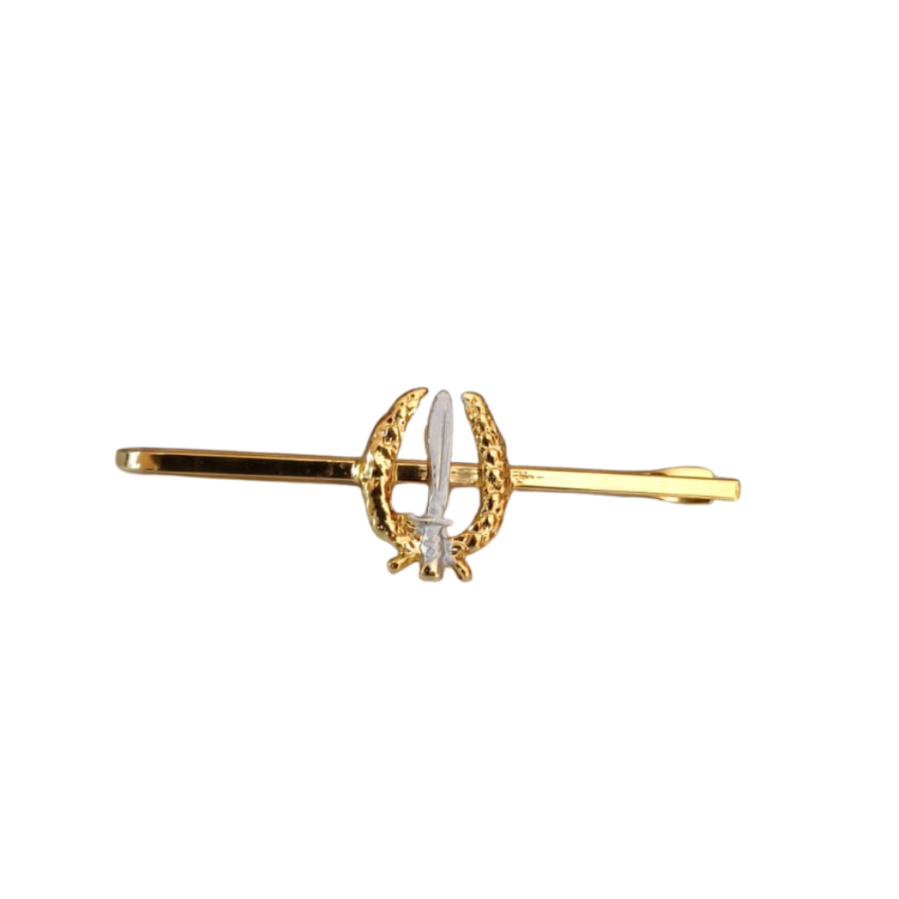 Sujetacorbatas dorado con el emblema oficial de Operaciones Especiales Roble y Machete. En el centro, el símbolo distintivo: un machete plateado en posición vertical, flanqueado por hojas doradas que evocan el roble, emblema de fortaleza y resistencia